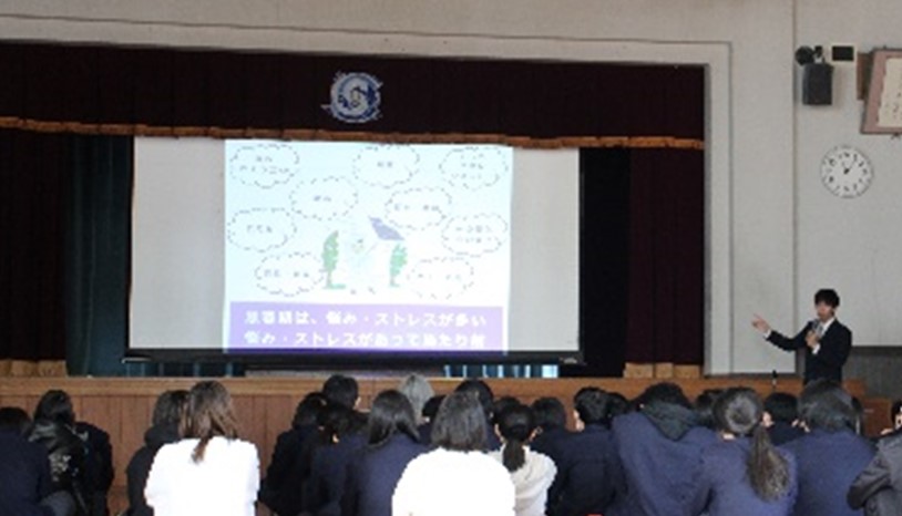 11月7日(金)3限目に、公立学校共済組合北陸中央病院の 岡本直人 公認心理師・臨床心理士より、SOSの出し方に関する講話をいただきました。講話の中で、ストレスが溜まらないように上手に抜く方法として「相談」の重要性を取り上げ、なぜ相談が効果的なのか、また相談方法について丁寧に説明していただきました。集中して講話を聞いているみなさんの姿が印象に残りました。