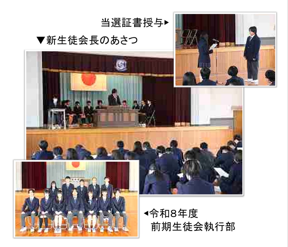 次に新生徒会長に当選証書が渡され、その後、令和8年度前期生徒会執行部より、今年度の活動や重点項目の説明がありました。